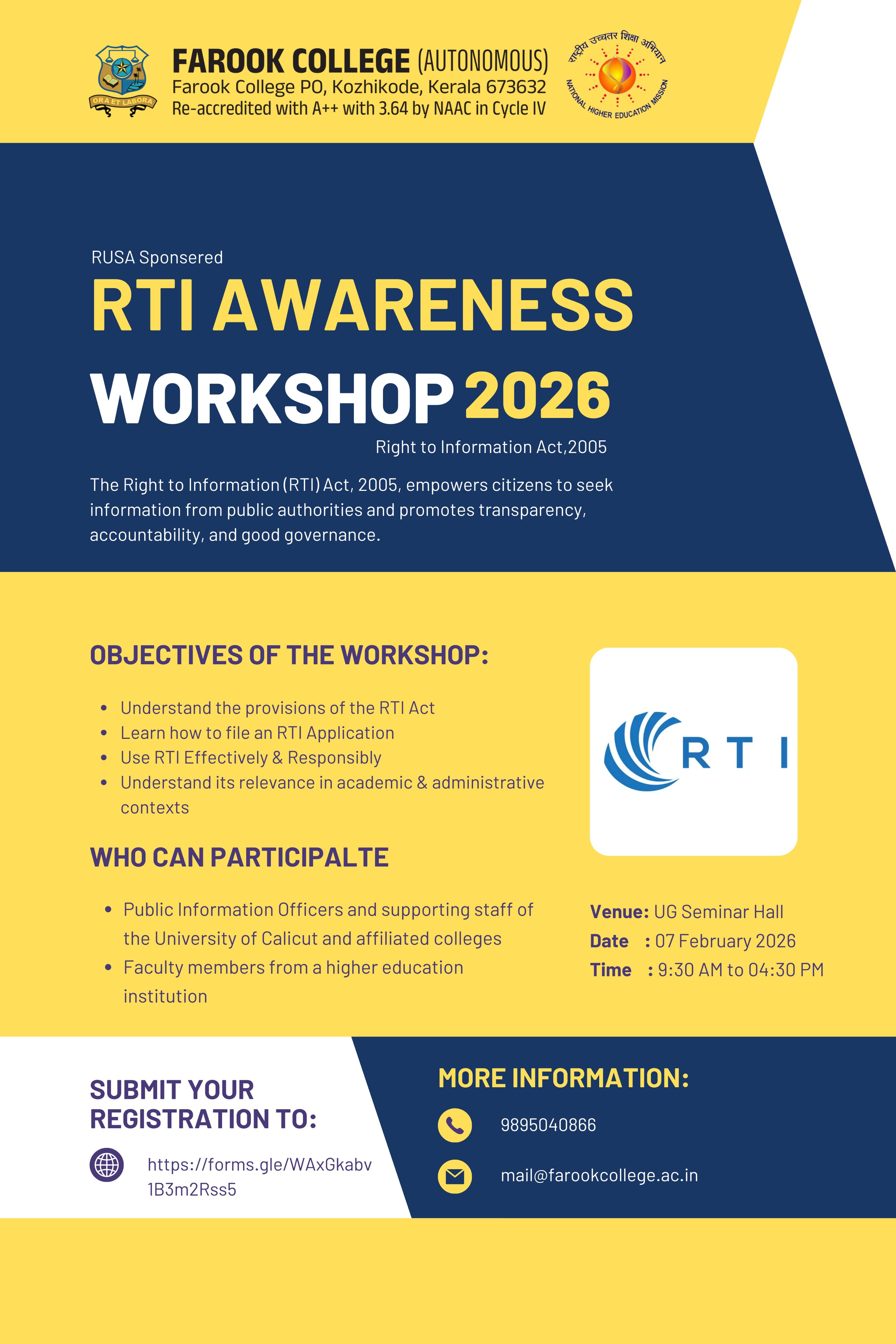 Farook College (Autonomous), Kozhikode is organizing a Workshop on the Right to Information (RTI) Act, 2005 on 07 February 2026.