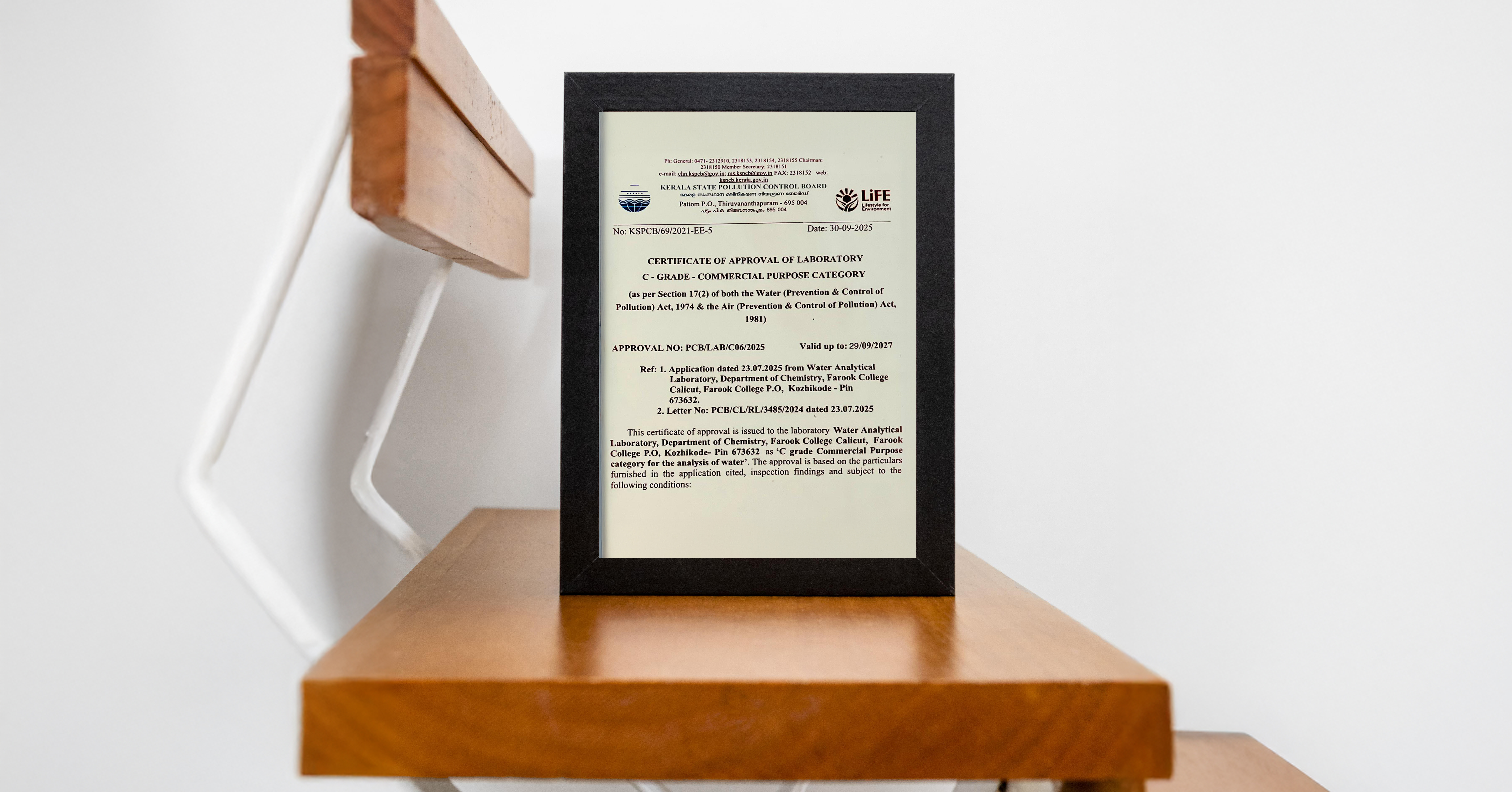 Farook College's (Autonomous) Water Analytical Laboratory, Department of Chemistry, has achieved a significant milestone by obtaining the Certificate of Approval from the Kerala State Pollution Control Board for commercial testing purposes.